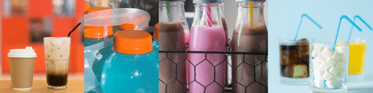 - sugar-sweetened drinks such as soda, energy and sports drinks, flavored milk, lemonade, fruit drinks, tonic, water flavored with sugar, teas and coffees flavored with sugar or syrup, milkshakes, and frappes