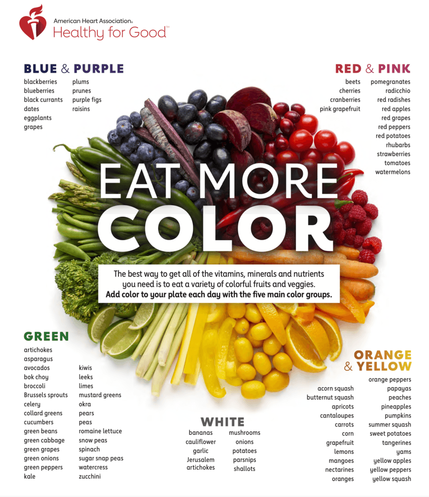 Phytonutrients provide the color, distinctive tastes, and aromas to plant foods. We need a wide variety of plant foods to keep us healthy, as each plant contains a different mixture of nutrients that protect us in different ways. This is why health organizations such as the World Cancer Research Fund and American Heart Association[2] remind us to eat plant foods from all of the color groups: red, pink, orange, yellow, green, blue, purple, and white. No one color is superior to another. Green foods have chlorophyll, lutein, sulforaphane, or indoles. Red foods have lycopene. Orange foods have beta carotene. Orange/yellow foods have vitamin C. White/green foods have allium compounds. Red/blue/purple foods have anthocyanins. In general, the more deeply pigmented a fruit or vegetable, the more nutrients it has. Often the colorful skins are the richest source of nutrients.